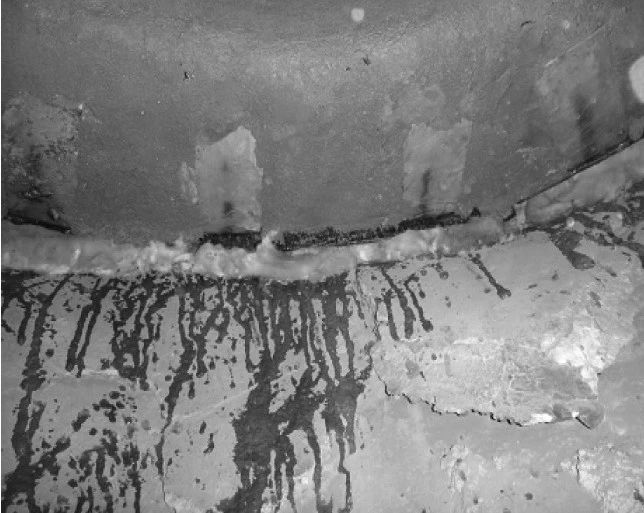 3、耐磨可塑料施工??伤芰戏笤O在施工構件上后,用木錘或橡皮錘搗打密實。塊與塊之間的接縫也應搗打密實,使接縫嚴密,將表面壓光、壓平。所施工部位與原來墻體接縫處應確保平滑過渡,不得凹進或凸出。用磷酸鋁溶液浸泡硅酸鋁纖維板封堵膨脹縫,避免鍋爐運行過程中出現竄風現象,導致非金屬補償器燒損。耐磨可塑料施工完畢后的膨脹縫封堵如圖4所示。